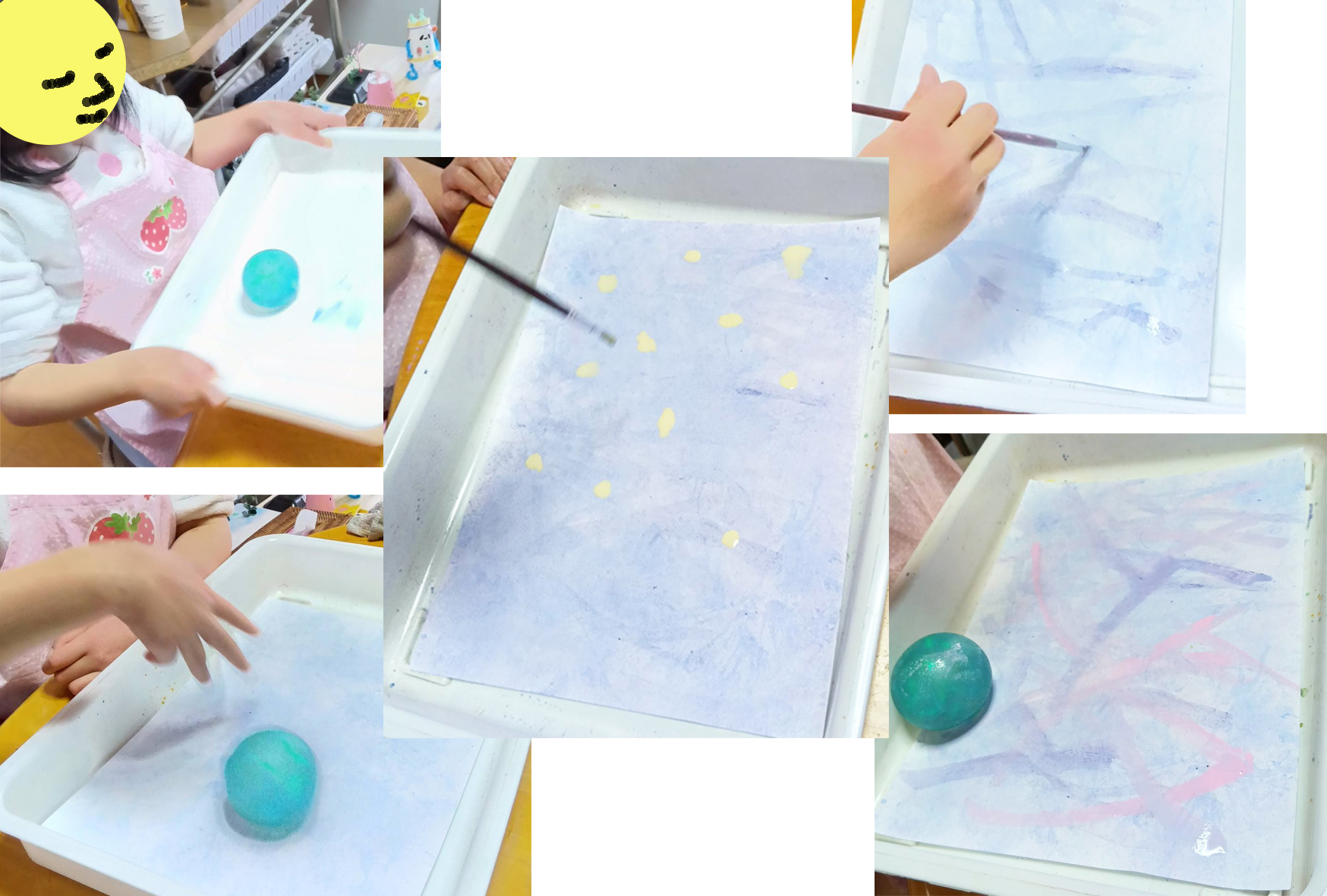 Nちゃん7才13回目のアトリエです。プニョプニョボールを手に持って、水彩が始まりました。ボールに絵の具を付けて、バットの中で転がすのです。パステルカラーの色が、少しずつ広がっていきます。筆で描いたあとでボールを転がすと、線は目立たなくなって、背景のひとつになっていくのでした。線や色をなじませていく感じです。歌いながら、何度もボールを転がして、好きな色を味わってました。ゆったりした時間が流れていくのでした。面白そうだったので、私も同じことをして遊びました。選ぶ色が違うと、また雰囲気も変わって来ます。ボールまかせのお絵描きです💗薄く色が付いていくのがじれったくなって、筆で何か描きたくなるのでした。Nちゃんは、クリーム色を作って、筆で、ポトン、と描いていって、「うん、これでいいや」と、完成しました。私の方は、何か足りない気がして、まだしばらく遊んでました。なんというか私は、ただ遊ぶ、というのを子どもさんたちに教わっている気がします💗