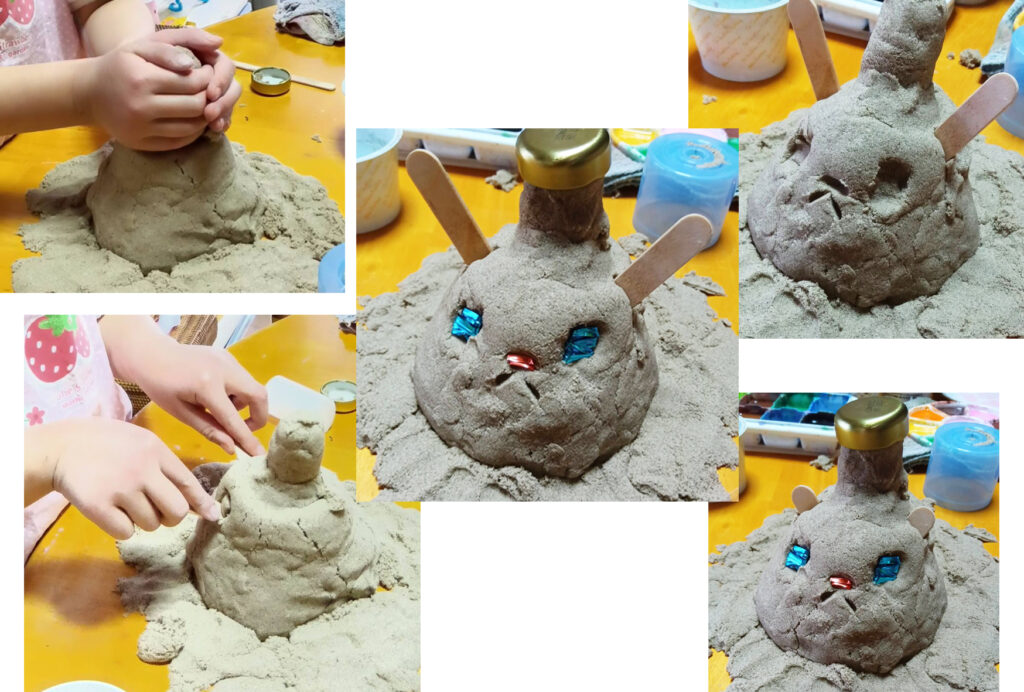 Nちゃん、今日は感触で遊びたい感じかなと思ったので、砂で遊んでみる?と聞くと、うれしそうに、うん!というのでした。久しぶりのキネティックサンドです。手触りを味わいながら、なんとなく形になっていきます。山を作っているなあ、と思ったら、顔が出来ていきました。アイスの棒は耳になっていました。ワイヤータイを丸めて、目と鼻にしています。ウサギを作って、それから、アイスの棒の耳を、ぐーっと押し込むと、「クマになった」💗って、笑ってます。ホントだね! クマの写真も撮りました。