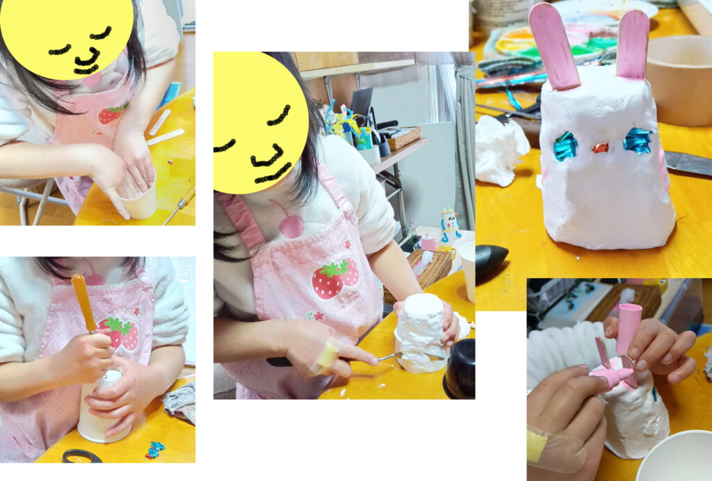 写真-3 紙粘土を形にするのに、手がよく働いてます。ウサギちゃんは、お家で耳を触っているうち、ぐーっと入ってしまって、クマさんになったそうです💗
