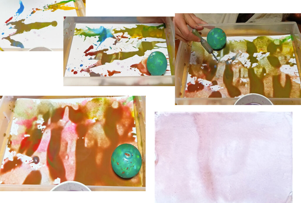 写真-5 お母さんの水彩。ボールを転がして、また色を足して、棒で線を描いて。感触を遊んでいる感じ💗