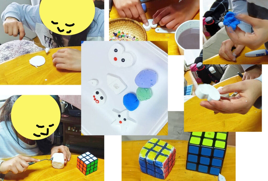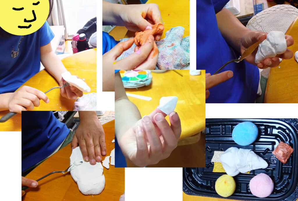 絵の後は、紙粘土をお渡ししてみました。2人とも、何にしようかな?と言う感じで、触ったり、こねたりしています。Aちゃん、手に持って形を作りながら、立方体っぽい形が出来ていきます。ルービックキューブを作るイメージが湧いたようです。おお、いいね!そしたら、線を付けたりするのに、これがつかえるかも、と粘土ヘラや、ペインティングナイフを出してみます。Yくんが紙粘土を平たくスライスする遊びを始めました。ていねいに何度もスライスして楽しそうです。Aちゃんも、立方体の表面を平らにスライスしていくのでした。目的が、定まった感じです💗