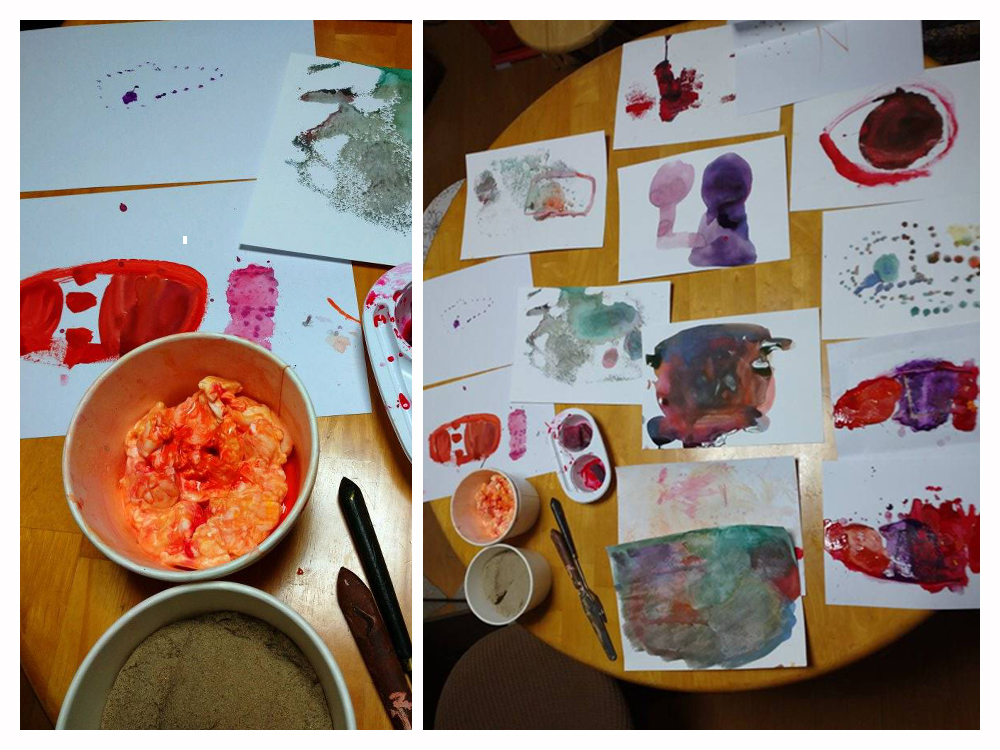 ちょっと、待ってね、とお母さんが言うと、すっと止まる。ストレスがなくて、これができるのはおかあさんとT君のやりとりが充分に上手くいっているのだなあ、と思う。気づきが生きるのは、今かもしれないしだいぶ先かもしれない。そういうものだと思う。アトリエの役割は遊びながら、何かに気づく面白さを提供すること。気づきを遊ぶ、かな?いつ、どんな風に気づくか、は本人が感じていく。だから、種をまくように描くのを遊ぶ。今日は、水彩を遊んで砂で遊んだり、紙粘土を色水に入れたり。たっぷり遊びました!
