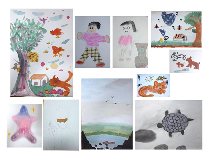 その後は、お二人とも2、3枚ずつ、自由に描いてました。Iちゃんは今回もネコを描いてます。何回も見に行って触ってネコの重さが伝わってくるような絵です。お母さんは風景を描いてました。広い広い空が印象的です。故郷の風景だそうです。それから、アトリエのカメも描いてました。カメもかわいいですが、そのまわりの水と黒い石の具合が素敵です。色を使うのが苦手と、お話してましたが、今、大事に感じる色を使っている実感があるのでした。ウチのアトリエで遊ぶ目的は、今の自分を探求して感じていくこと。実感は大事にしたいところです。実感は自分の拠点みたいなものだと思います。そこがしっかりわかっていると、実感と一緒に新しい感覚を試したとき変化がわかりやすいのです。変化をあれこれ遊ぶのも楽しいですが、今、持っている感覚を大事に広げていくのは静かな楽しみです。