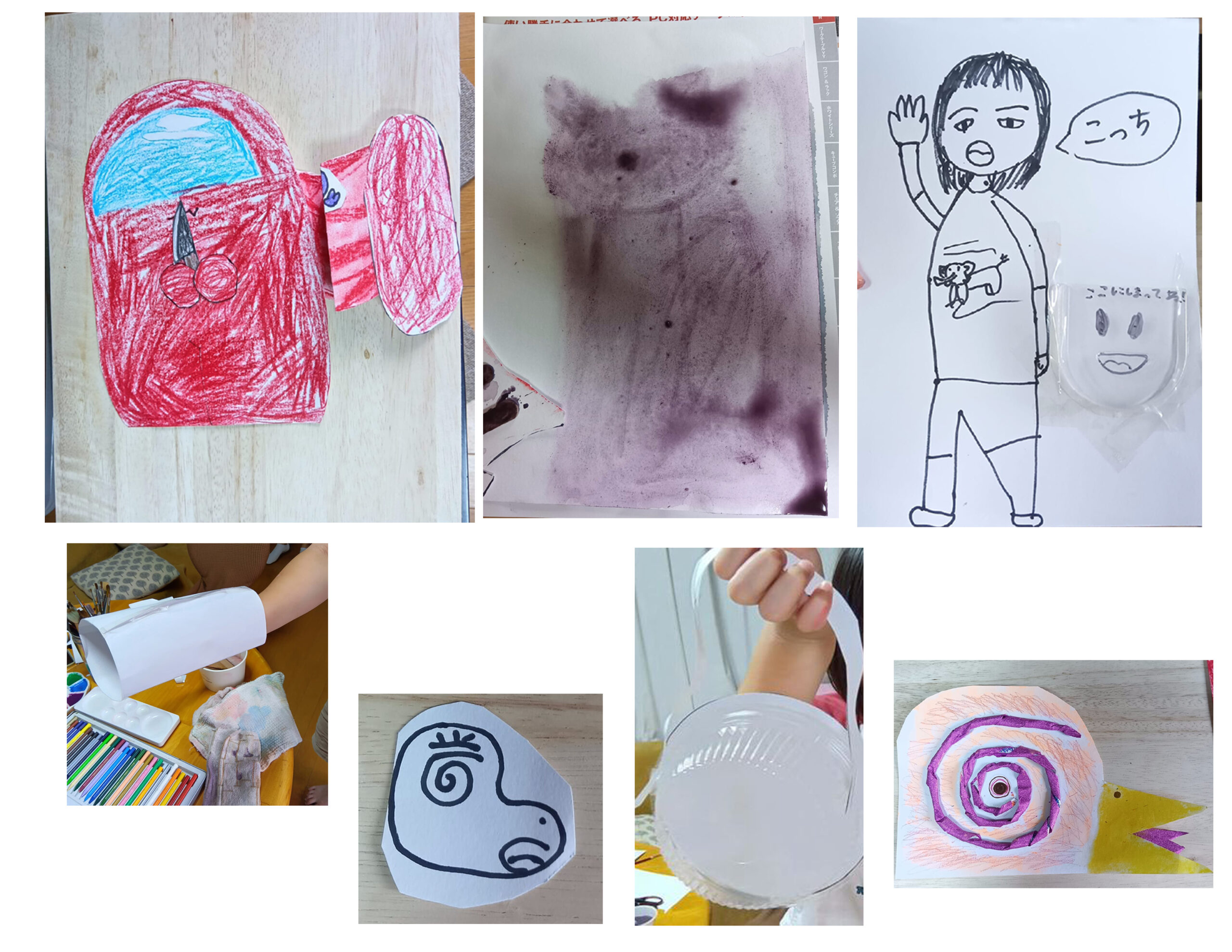 話しながら、聞きながら、工作は紆余曲折して何かになっていきます。細い画用紙、ねじって巻いていこうとしたけど、渦巻きを作って画用紙に貼ってみた。Iちゃんが、それ何?と聞きます。うーん、わからない、何にしよう。。?目にすれば?と言われたら目のように見えてきたので、目にしました。けっこう凶暴な鳥のイメージ。エイリアンを思いだしたからかも。意外なものができると楽しい!