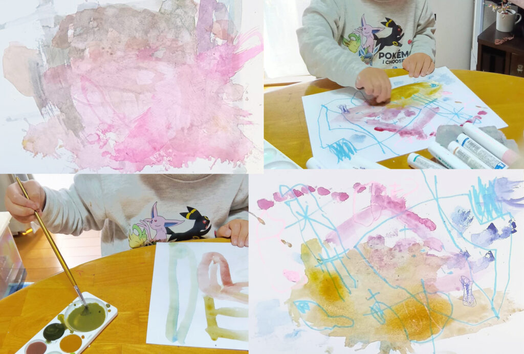 最後は、絵を描いて遊びました。お母さんの膝に座ったりしながら、気楽さを味わっています。ポスカで、ぐるぐる線を描いて、スポンジで絵の具を付けたり、筆に絵の具をつけて、色を遊びます。パレットでいろんな色を作って遊んでいます。水彩は水遊びに近いので、冒険もできますが、気楽さを味わうときもぴったりです。気楽に遊んでいるうち、Eくん、水遊びわんぱくモードになって笑ってます💗今、やってることと気持ちが、ぴったり一緒ですねー!💗とお母さんにお話ししました。この感じ、大人になっても、すごく大事だと思います。大人は、うっかりすると、別々のことを平気なな顔で出来るようになって、ぴったりの方を忘れちゃいますから。。