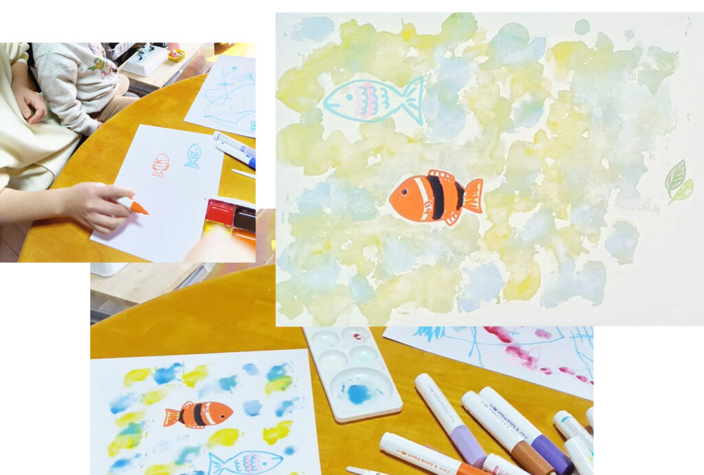 写真-3 お母さんの絵です。Eくんを抱っこしながら、ちょっとずつ描く。ニモ💗のんびり泳いでます。