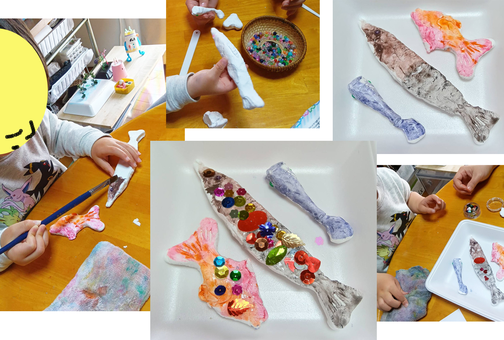 で、どうやってくっつけるか?です。両面テープは、うまく粘着しなかったので、透明なボンドを塗って、そこにスパンコールを置いていくことにしました。Eくん、小さい指で、慎重にスパンコール、1枚ずつ置いていくのでした。ときどき、ボンドが指について、気になるようなので、ピンセットを渡してみました。あとで考えたら、4才のEくんには難しかったかもしれません。でも、Eくん、ピンセットに挑戦し続けてました。最初に茶色く塗られたサンマにスパンコールは、よく映えて💗とても素敵な感じになりました。お家で、冷蔵庫に貼って遊べるように、マグネットシートをお渡ししました。紙粘土が乾いたら、ボンドで貼るのです。お家で上手くできたかな?