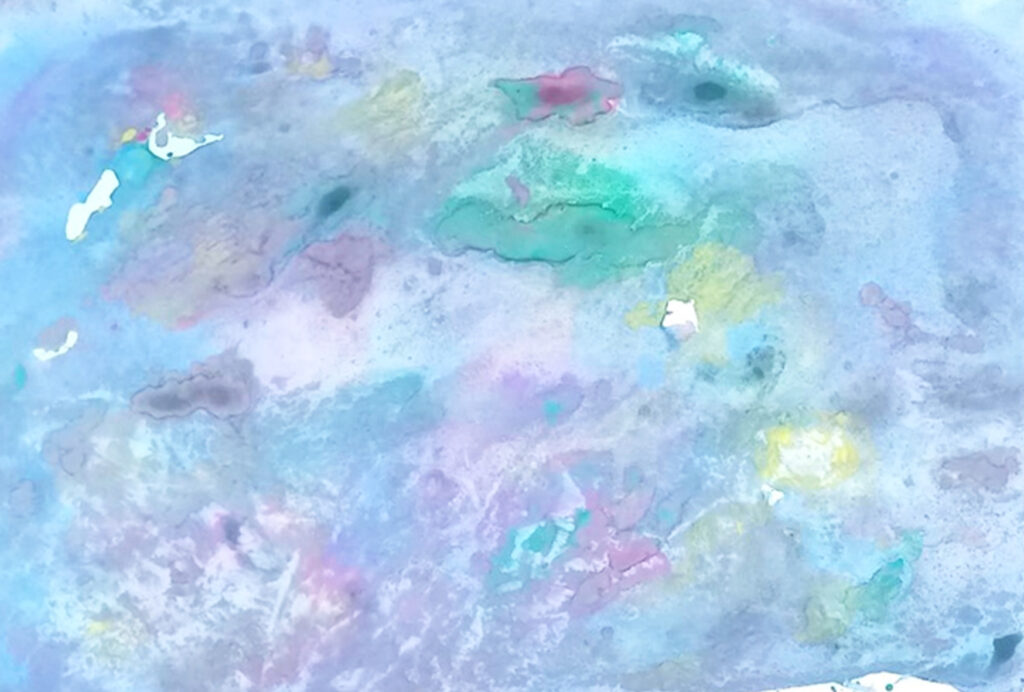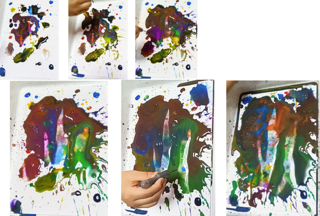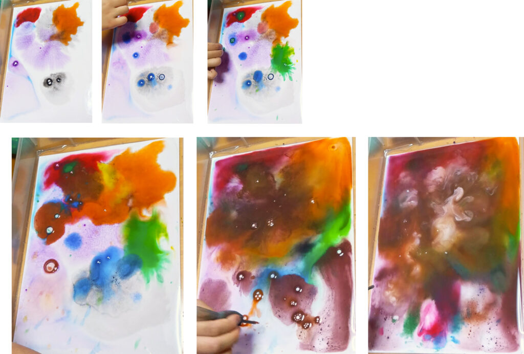 スポイトの絵、2枚目は、画用紙を水で濡らしてから始めます。2人はさらにスピードアップして描いていきました。どんどん色が足されて混じると、バットを傾けて色が移動していくのでした。色の跡を見ているのは、砂浜で波の跡を見ているように、楽しいのでした。