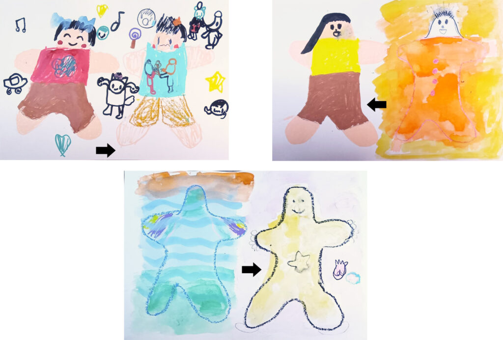最後に、ヒト型ぬり絵、完成させます。いい感じです。それぞれの変化が楽しいです。Eちゃんは、ヒト型の表情が、ぐっと豊かになって、登場人物が増えてます。Yちゃんは、シンプルな絵になりましたが、集中度が上がって、焦点がぱちっとあった感じがします。おばあちゃんの絵は、海のイメージから始まった絵なので、最後の絵には、ヒトデが登場して、ヒト型には顔が描かれてます。のどかな雰囲気なのです💗