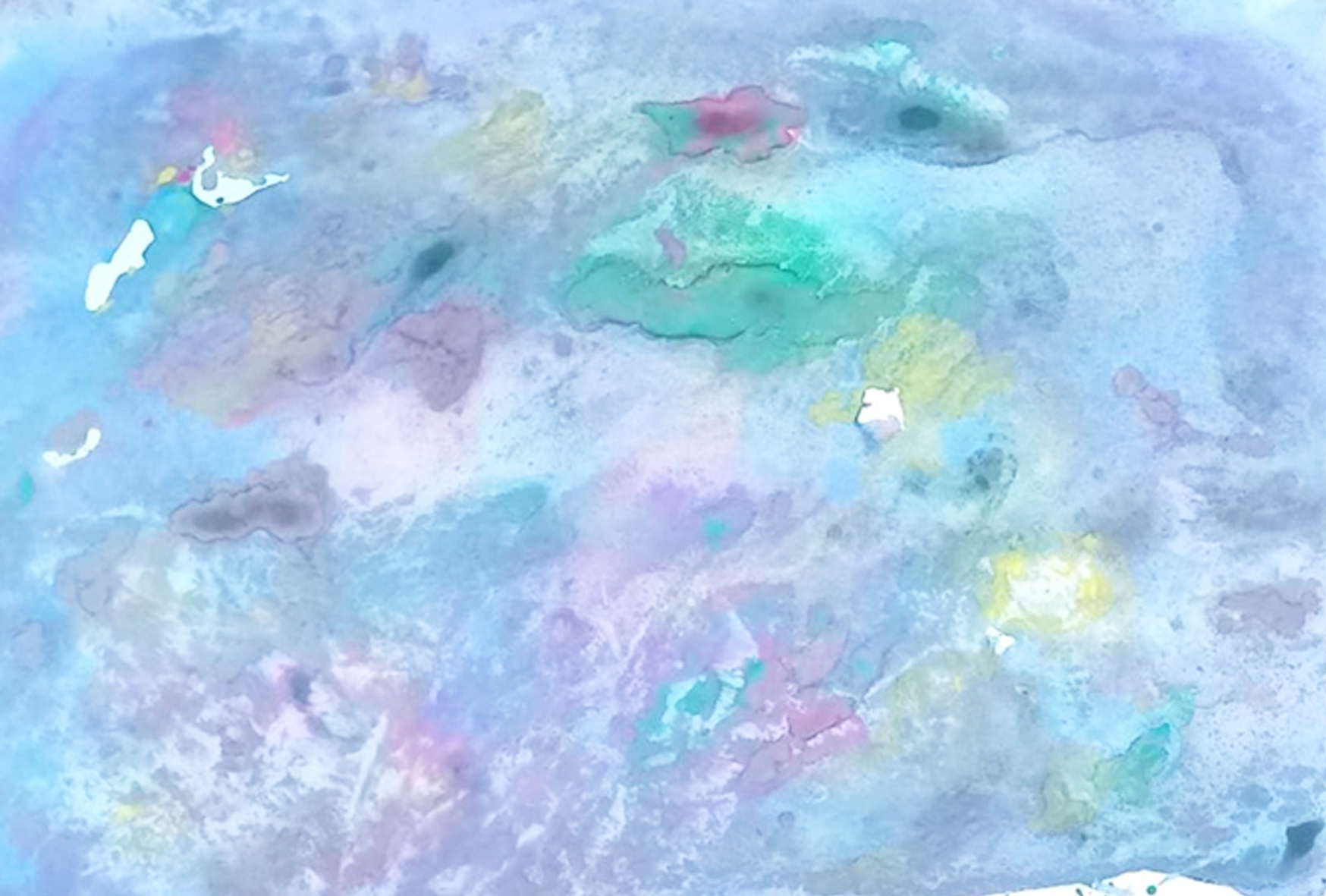 これを、1人でやりたい、とEちゃんのリクエストがありました。OKです。このバットが空くまで20分くらい、別の絵を描いて遊んでてもらいましたが、バットと画用紙を渡したら、EちゃんもYちゃんも、さっそくスポイトで遊んでました。2人がそれぞれに、色を落として流して遊んでいるのを、おばあちゃんは、嬉しそうに眺めていました。2人とも、気の済むまで絵の具が混ざっていくのを、よーく味わっている静かな時間でした。ただ、水の量が多くて、置いておく時間も短かったので、乾燥させると、とても薄くなって、気配だけ残っている絵になりました。途中の素敵な感じは、写真で見てね💗