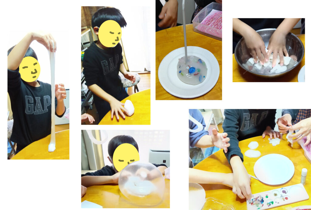 スライムは水に浮く刀削麺みたいになっていたけど、ヨーグルトの空き箱に入れて、無事に持って帰れたかな?きっとお母さんが、ビニール袋に入れて、カバンの中で倒れないように、運んでくれたと思います。