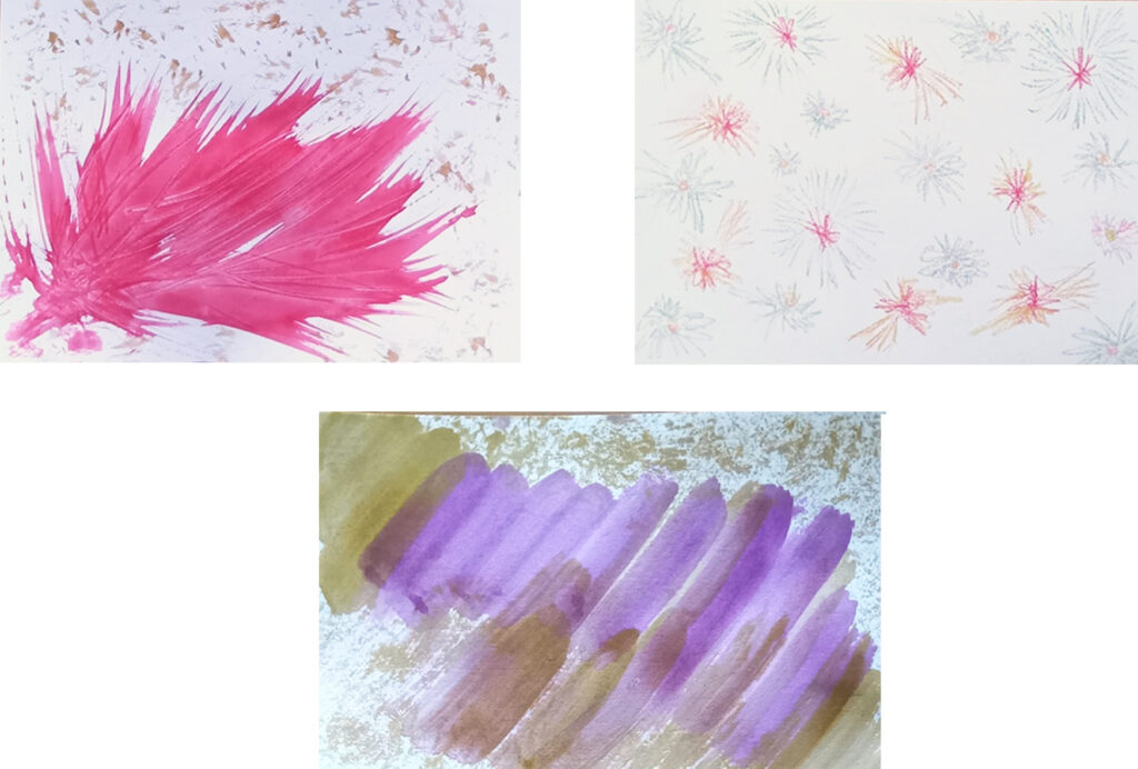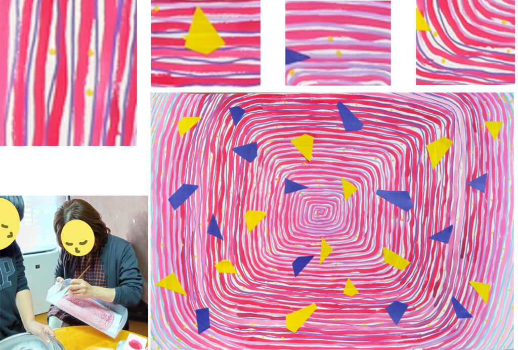 5回目だなあ!という展開がありました。1回目から見たら、お母さんが自分の絵を描く時間ができてきました。前回もかなり落ち着いて、絵を1枚描けたんですが、今回は、1枚描いた後で、「もっと激しい感じの絵にしたかったんだけど、こうなってしまった」と言うのでした。5回目で、そんな正直な言葉が現れたのだなあと、感慨深いです。私の方でも、このお母さんなら、どんなやり方がやりやすいだろう?というのを考えられるのは、これまでの4回を見てきたからなのでした。