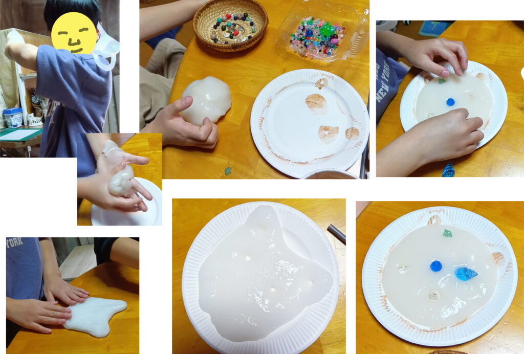 意外な面白さといえば、スライムです。今日も、スライムを作って遊びました。作るところから、アグレッシブなのでした。スライムをぐいぐいこねる、机にたたきつける、風船のようにふくらませるお皿に伸ばして、ピザにする、トッピングを乗せる、などなど。