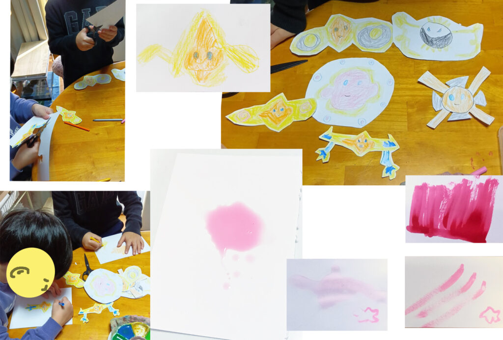その間、KくんTくんは、ポケモンのキャラを、いろんなバージョンを創作して描いているのでした。Kくんは、絵の具できれいなピンクを作って、小さい絵を2枚描いてました。