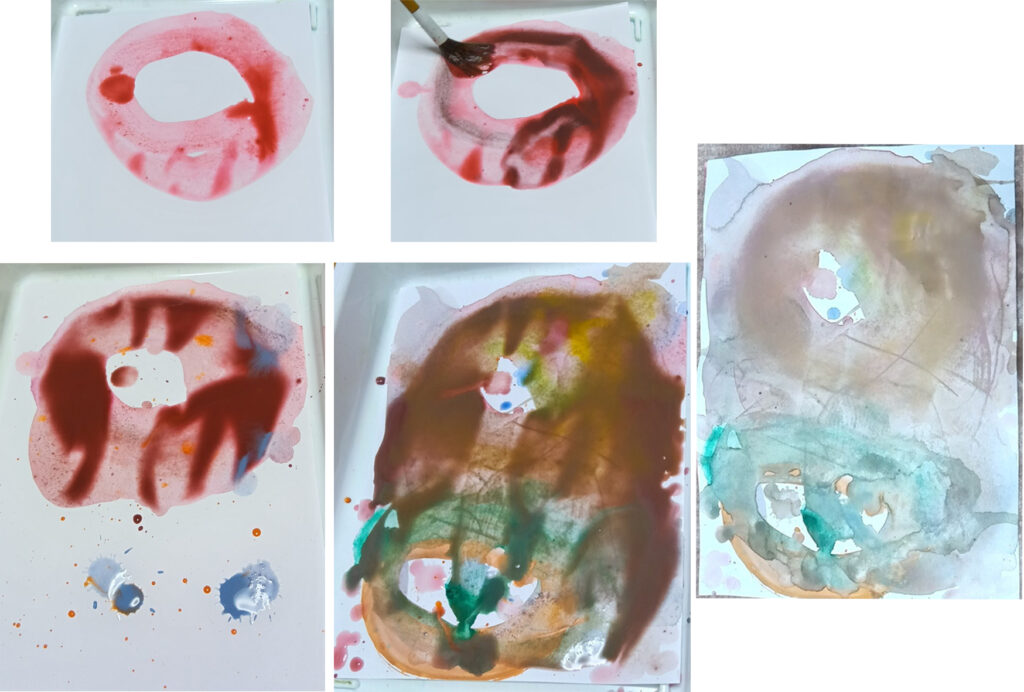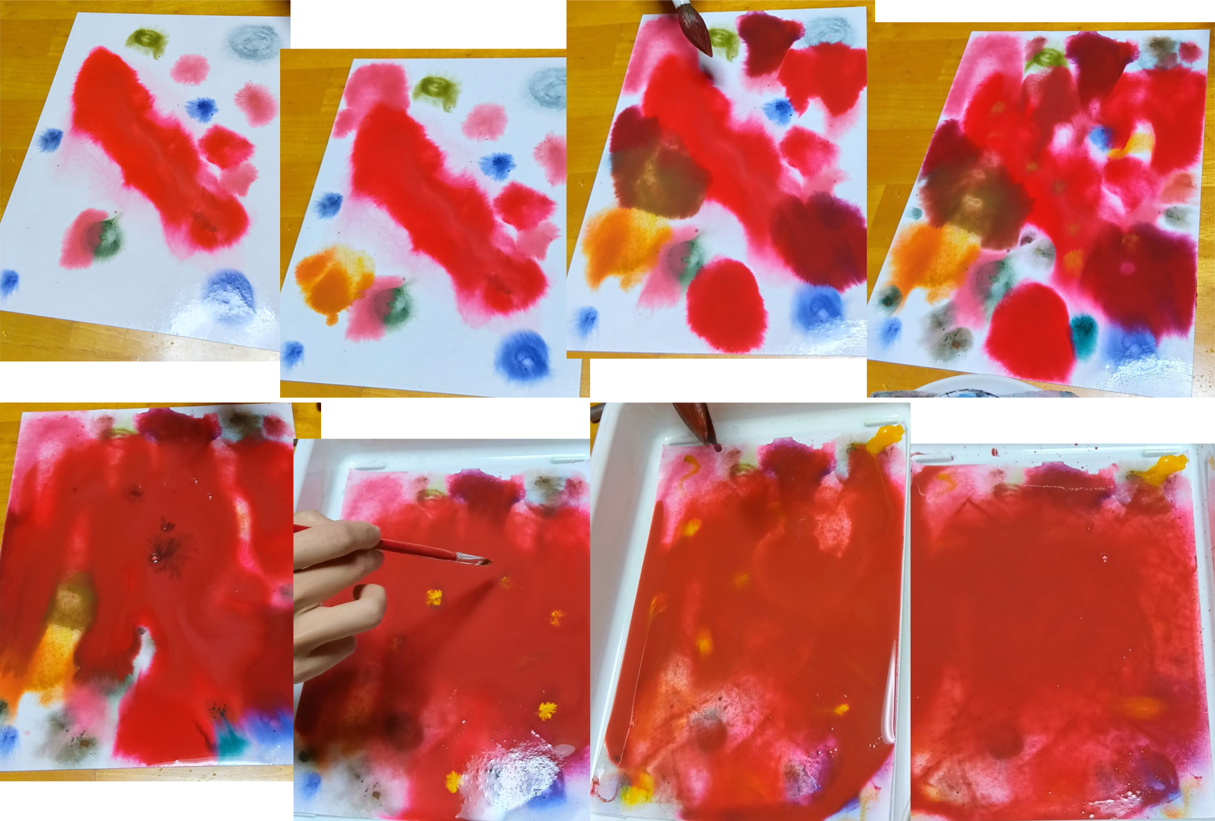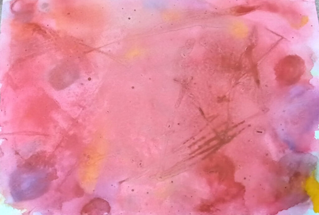 そして、少し離れたところに、お母さんが別の色を置いていきます。色が増えていくたびに、距離が近くなって、自然に混じりあっていきました。その上にまた、色を足して、とても豊かな赤い絵になりました。乾燥すると、残念ながら、みずみずしい赤い色はなくなってしまいますけど、静かに時間をかけて遊んだ味わいは残っています。