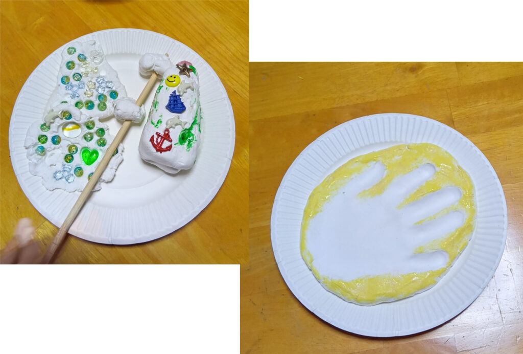 お母さんも紙粘土で遊びながらHNちゃん、の手形を取るのを思いついて、2回トライして、上手く行きました。手形を押していく紙粘土の土台の厚みが、大事だったんですねー!土台作りは、HNちゃんも一緒に作るのでした。