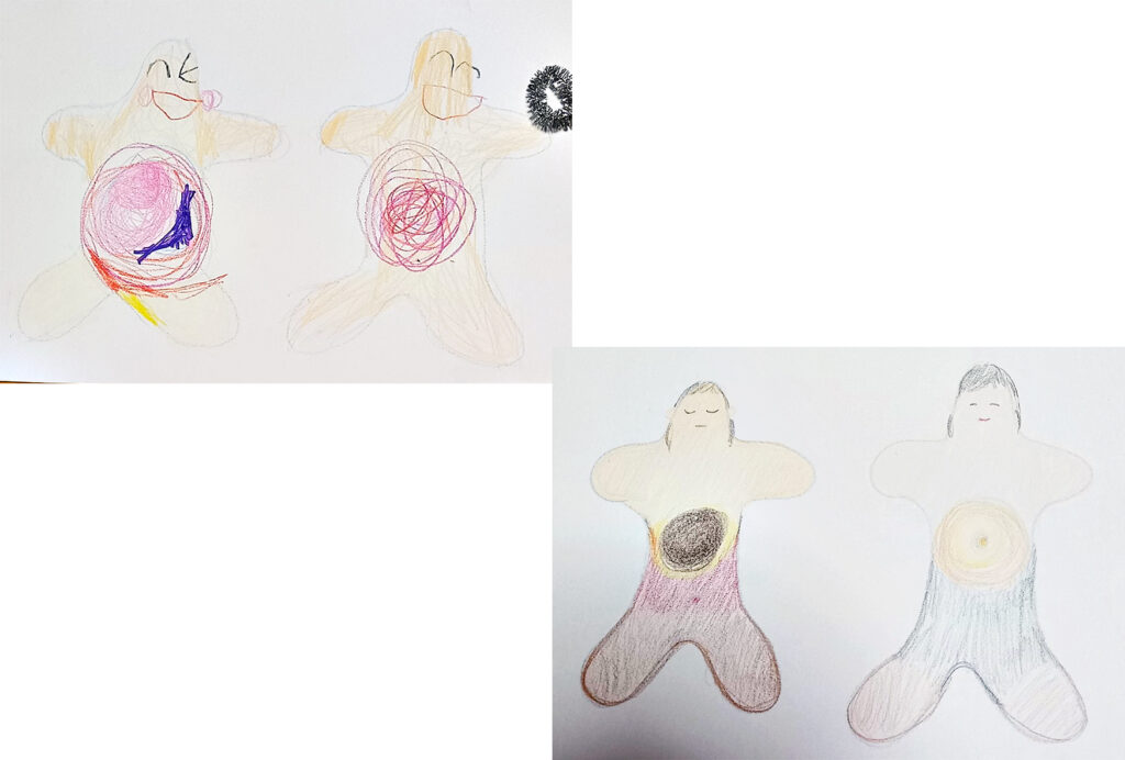 写真-4 ヒト形ぬり絵、左が最初、右が最後に描いた絵です。上がHNちゃん。のびやかな笑顔に、ほれぼれ💗します。下がお母さん。静かな絵です。最後のぬり絵、穏やかな笑顔です💗