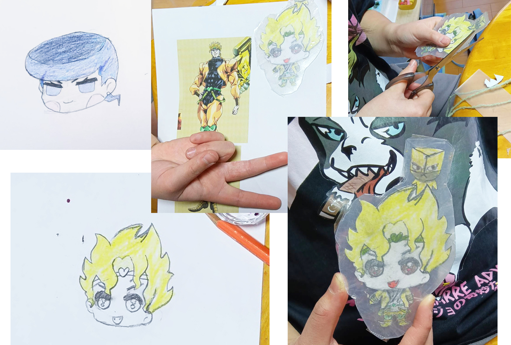 Iちゃん9才、51回目のアトリエです。今日は、ジョジョの9部を5巻くらい持って来てました。その中から、模写する絵を探していたようですが、適当な描きやすさの絵が見つからなかったらしく、スマホで、マスコット系のジョジョの顔を探して描き始めます。リーゼントみたいな髪型です。2枚目は、金髪が立ち上がったジョジョを描いてます。マスコット系の顔でも、元絵はバランスを大事に作られているので、Iちゃんもそこを大事に描いているのでしょう。そうなると、えんぴつと消しゴムは、必需品なのです。