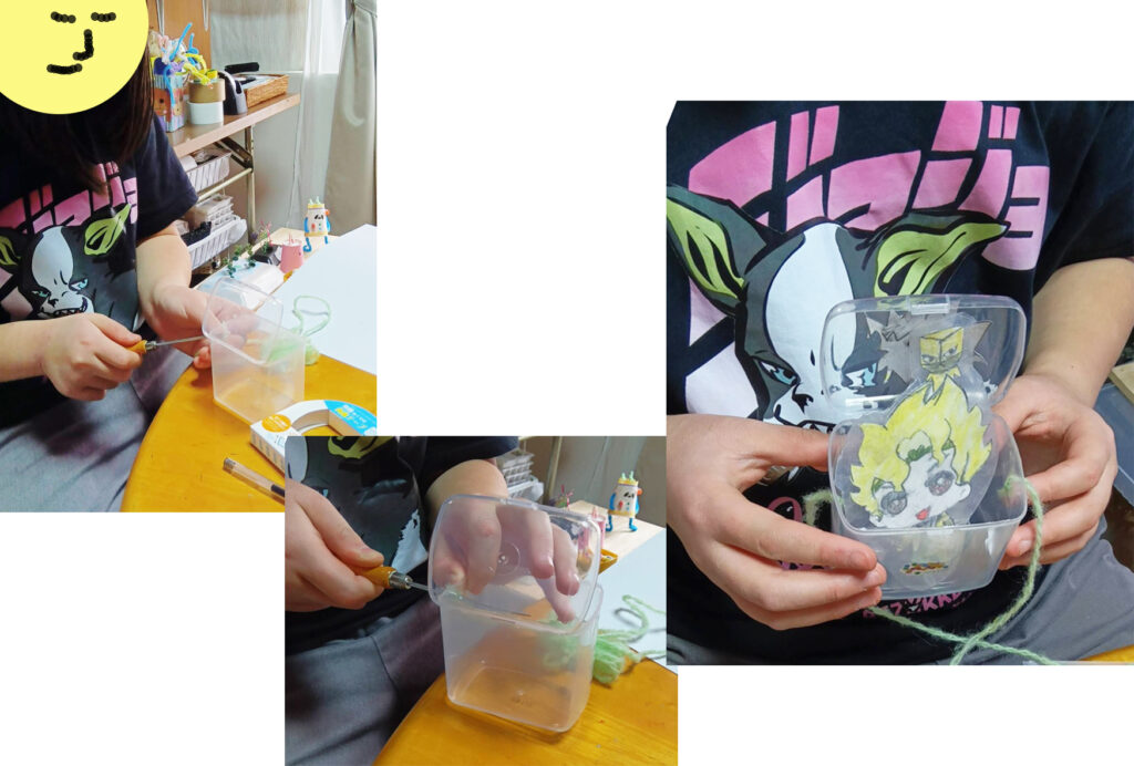そして、材料箱からプラスチックのケースを持って来て、両端に穴を開けて、毛糸を通してます。何ができるのかな? Iちゃんは、このケースを首から下げて、さっきのジョジョを入れるのでした。おお、そうやって使うのか。他には何を入れるの?「飴とか入れるの」。ああ、それなら、ジョジョの絵を、何かでカバーするのはどう?そうしたら、絵が折れたりしないし、と、クリアファイルの切れ端を見せて、これなんか使えるかな?と渡します。Iちゃん、クリアファイルを、ジョジョの形に切って挟んで、縁を透明なテープで留めていきます。ケースに収まる大きさにするのに、何回も修正しています。いい感じの大きさで、完成です。