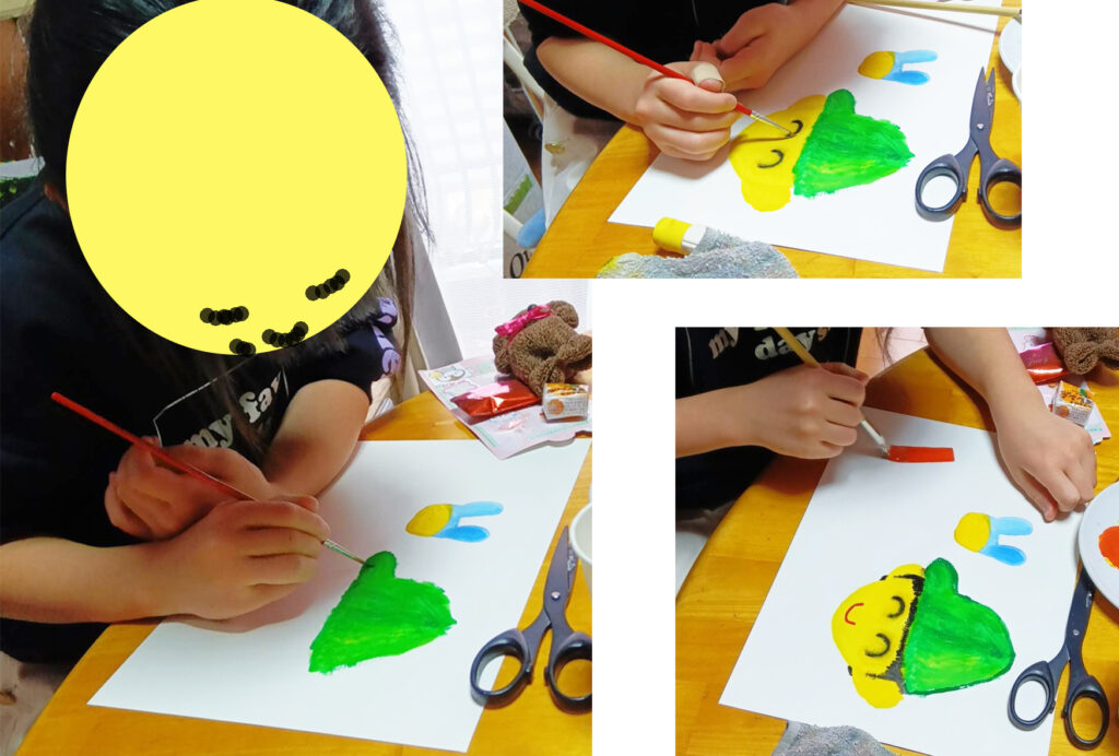 このくらいかな?言いながら、慎重に切ってます。そこから先は、1人でどんどん作ってました。耳や手の位置を大事にして、作り直しながら丁寧に進んでいきます。最後、ビーズで目と鼻を付けることにしました。Aちゃん、目のビーズを、どれがいいか顔に置いてみて選んでます。合わないビーズだと、こわい感じになったりして、置いてみるって大事です。決まったら、小さく切った両面テープで仮留めしてもらって、私が針と糸で留めることにします。