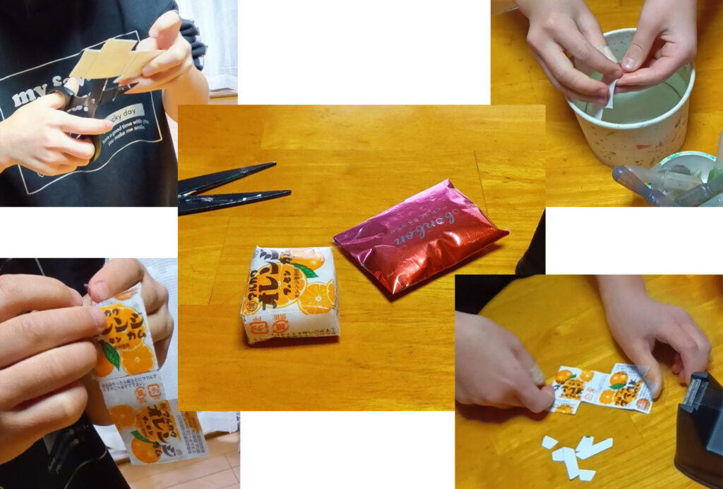 A ちゃん9才、10回目のアトリエです。「今日、やりたいこと、あるんだ!」と言いながら、始まってます。おお、いいねー!駄菓子のガムの小さい箱を見せてくれます。おー、何ができるんだろう?と言いながら、私は、セロテープやハサミを準備します。ハサミで、余分なところをサクサク切り落として、それから、セロテープで、外側のきれいな面をカバーしています。それを、水に漬けて、内側の紙を剥がしていきました。まだ、何ができるかわかりません。おー、紙ってはがれるんだねーとか言いながら、見てました。Aちゃん、「センセーは別のことしてていいよ?」というので、私も工作を作ることにしました。じっと見られてても、落ち着かないですからねー!