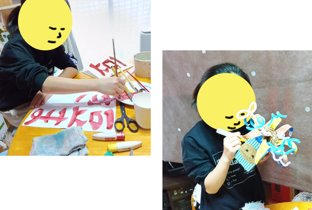 写真-4 水彩の後で、のびのびと習字を楽しんでます。頼んだ工作も、楽しそうに手伝ってくれました。