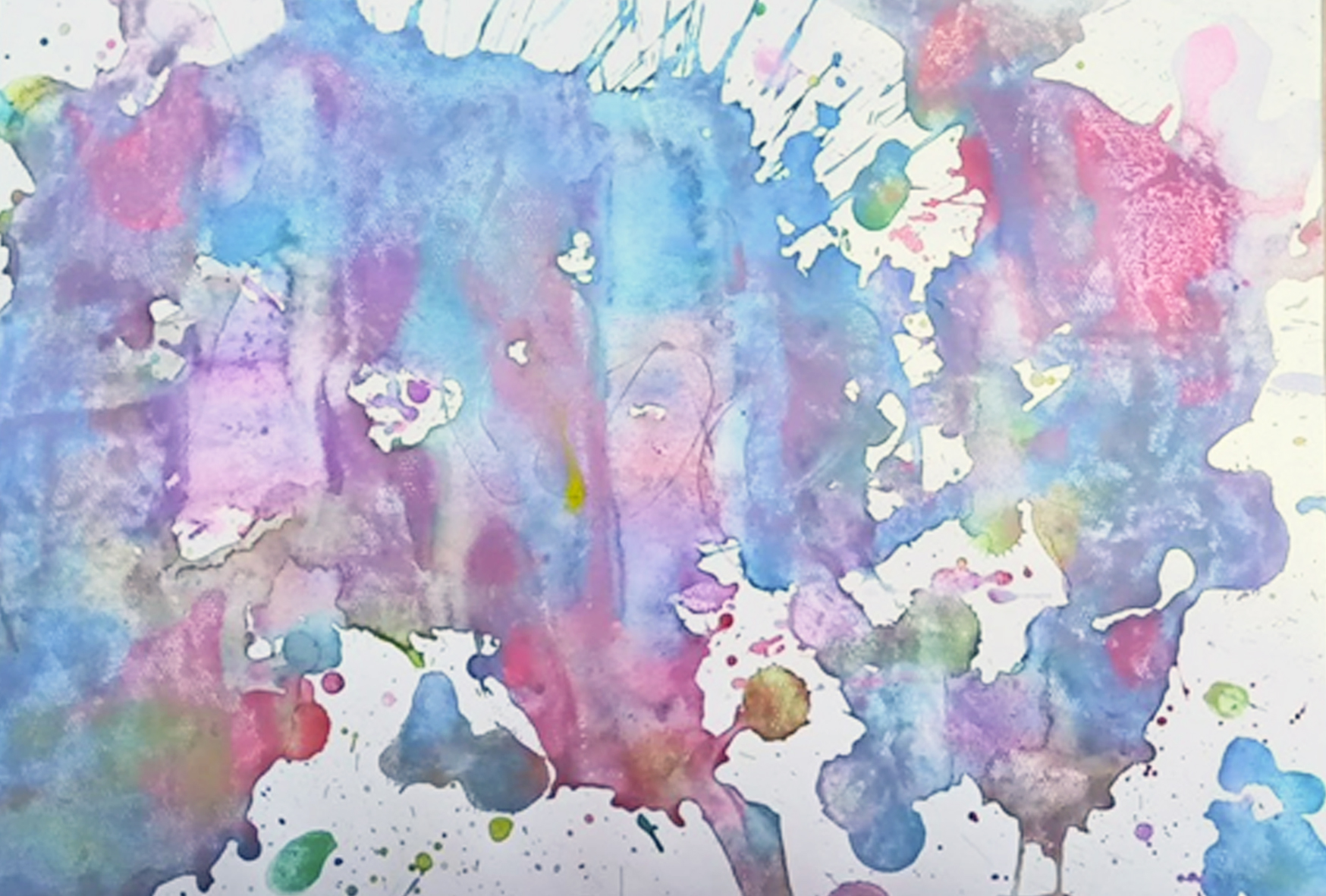 スポイトの絵を2枚遊んだ後は、それぞれで絵を描くことになりました。Sくんは、歯ブラシや、ストローで絵を描いて行きます。Nちゃん、最初はお兄ちゃんを意識してましたが、だんだん自分の絵の面白さを楽しんでました。筆を持って絵の具で描くのが、面白くなって、だんだん水の量が増えてきたので、一緒にバットに移動しました。画用紙のそっちの端を持ってくれる?とお願いしたら、上手に持ってくれました。それからMちゃん、あれを使ってみたいと、サインペンを使ったら、絵の真ん中がちょっと破れてしまいました。破れちゃったね、とお話して、そのままお絵描きは続くのでした。