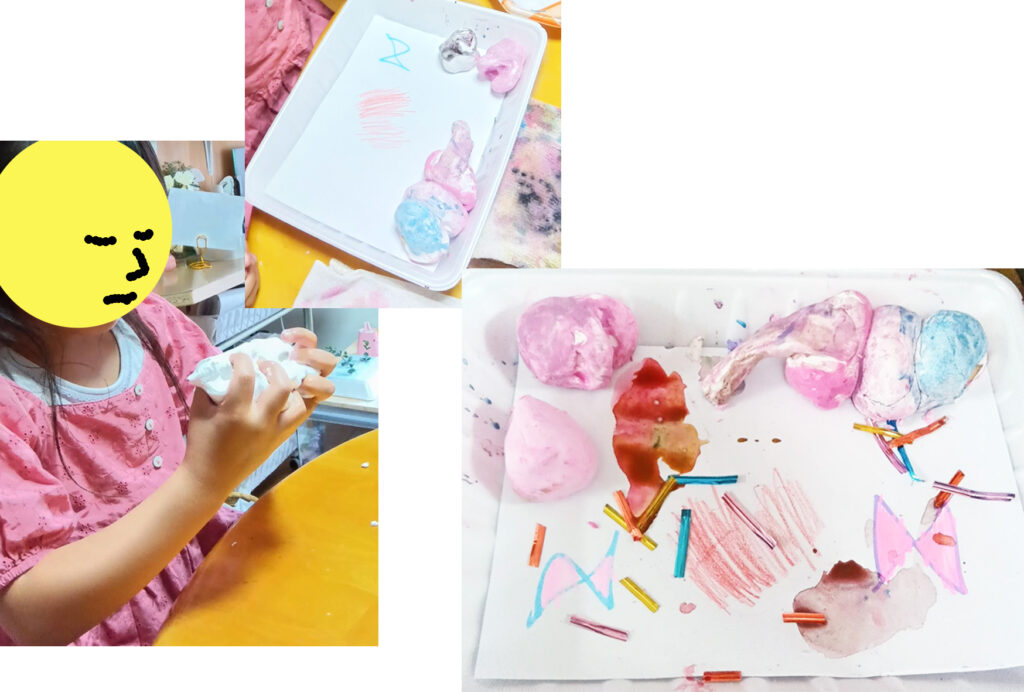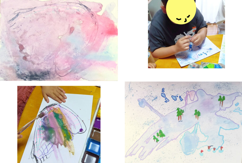 先日は楽しい時間をありがとうございました!子供たちは思った以上にとても自由に楽しんでいて、みんなで色を重ねていく遊びはみていて性格がでているなぁと母としても面白かったです。普段から2人はよく絵を描いたり、工作していますが、自分も混じりながら描いたり眺めたりする時間がなかなかないため、有難い時間でした。