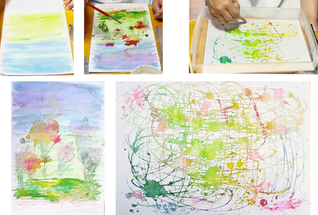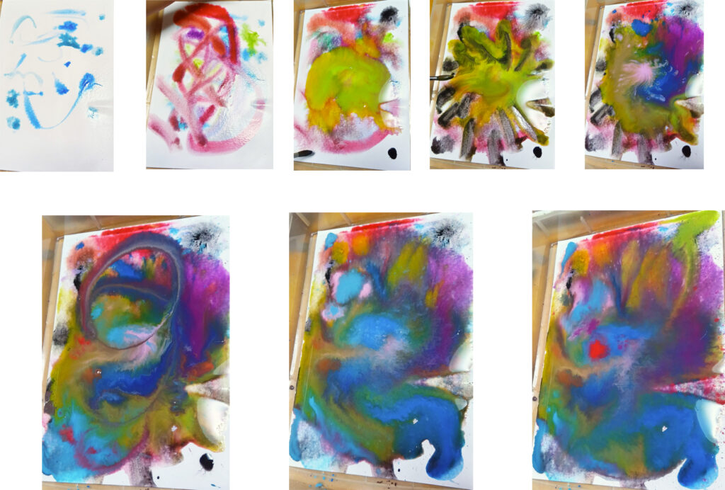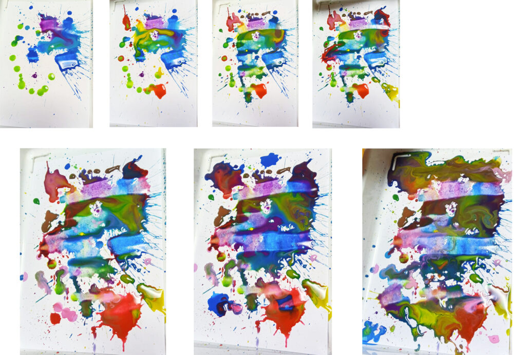 写真-2 3人で描くスポイトの絵、1枚目、最初から完成まで。