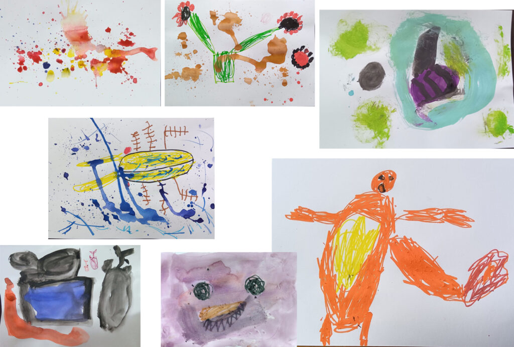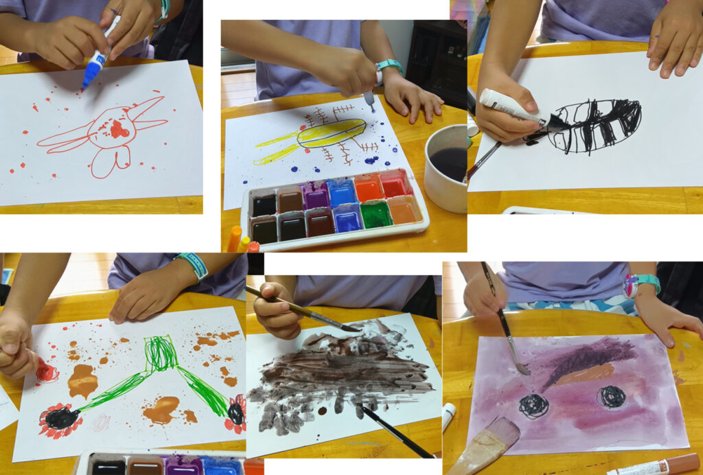 写真-2 Mくんの水彩。いろんなタイプの絵が描けてるのでした。最後に描いたオレンジの怪獣、いい勢いで描けてます💗