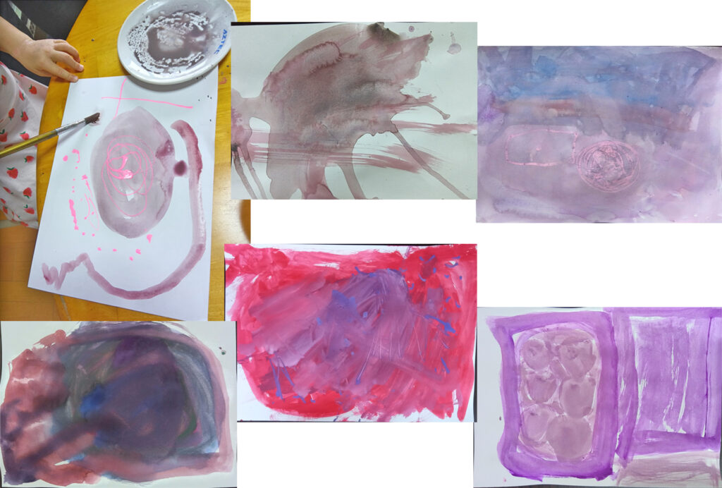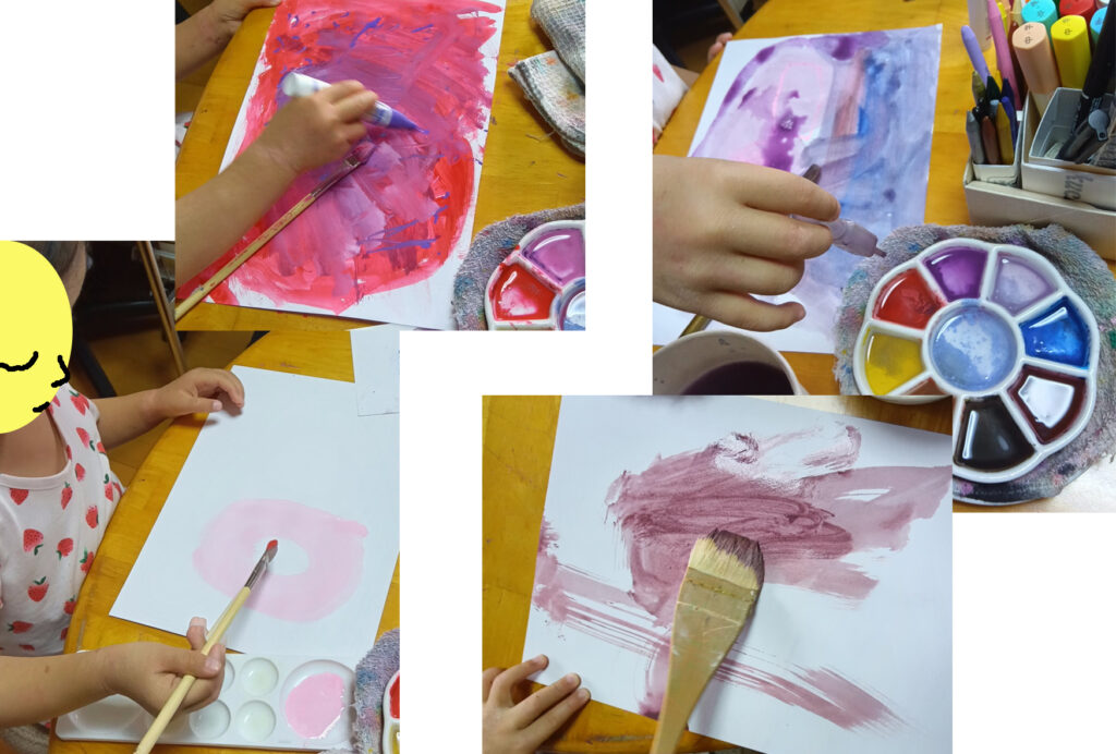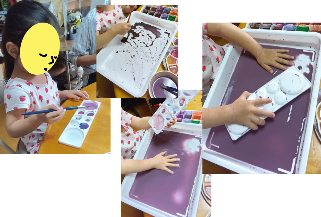写真-7 色水遊びになっていきました。絵の具を足して、少しづつ色が変わるのが楽しいのです。