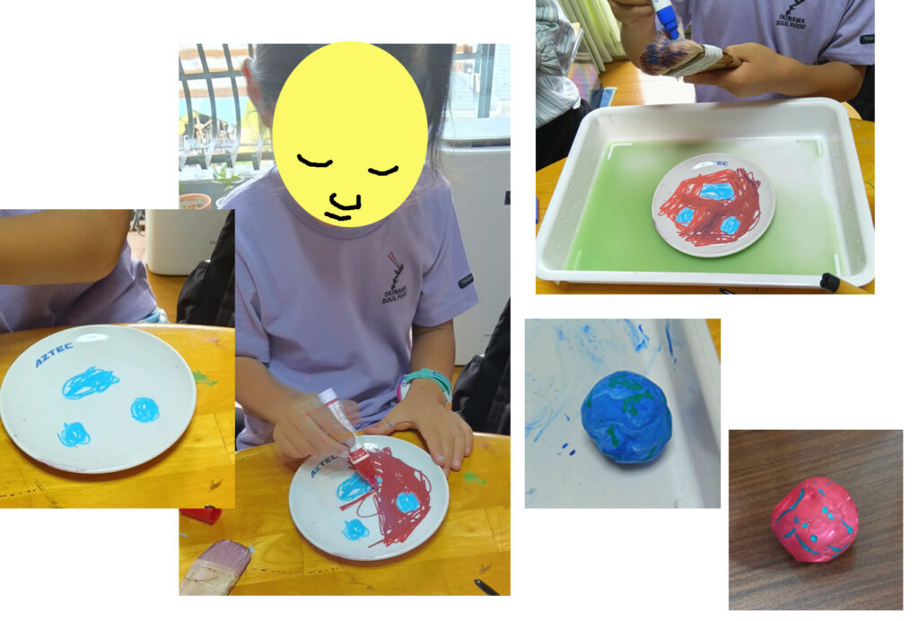 写真-6 Mくん。ポスカでお皿に顔を描いてます。紙粘土で、青い地球と、赤い星(かな?)