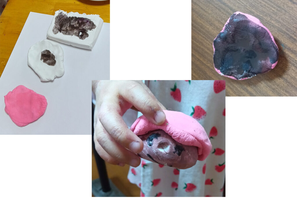 写真-9 Sちゃん。紙粘土です。こねながら、形が出来ていきます。顔が描けました。