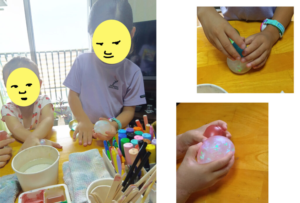 Mくん、Sちゃん、流れるように!絵を描き続けていました。あとで最初のプニョプニョボールを遊んでいる写真を見たら、二人はもう、ポスカや、クーピーや、画材を見つめているのでした。もう始まってたんですねー!