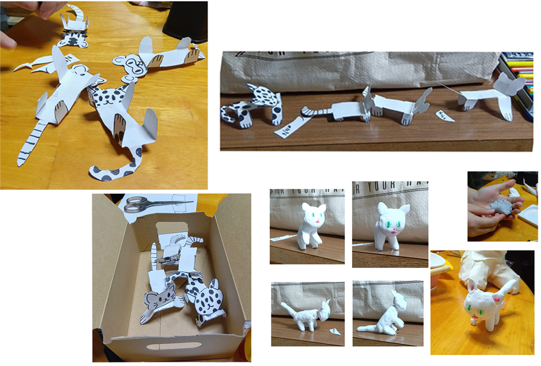 紙のネコたちの後、紙粘土で作りました。1時間くらいかけて、大事に作ってました。細かいところもバッチリ出来てます。手のひらに乗るようなネコだから、目なんて、ホントに小さい!写真で改めて見ると、よく作ったなあ!帰りはお母さんが、そっと手に持って帰っていきました。もう1匹、黒猫も作りたかったけど、続きはお家で。紙粘土に黒を混ぜてるとき、なぜかギョウザの形ができました💗