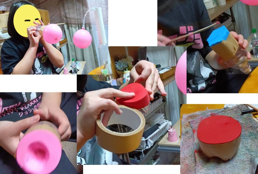 それから、ペットボトルを短く切って、口を切り落とした風船を、ぐーっと引っ張って広げて、かぶせます。私はペットボトルを押さえる係です。かぶせた風船の端を、ガムテープで留めています。風船は、タイコの打面のようにピン!と貼られたので、割りばしで叩くと、カン!と鳴るのでした。もちろん、鳴らして遊びました💗Kちゃん、作りかけの工作は、アトリエに置いて行きますが、このタイコと、ストローを挿したボトルは、持ち帰りました。お家で遊べるモノは、持って帰るのかな?
