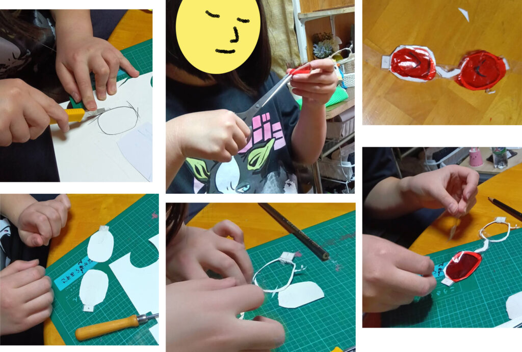私が別の工作で赤いセロファンを出してみたら、Kちゃん、それでメガネを作るのを思いつきました。
