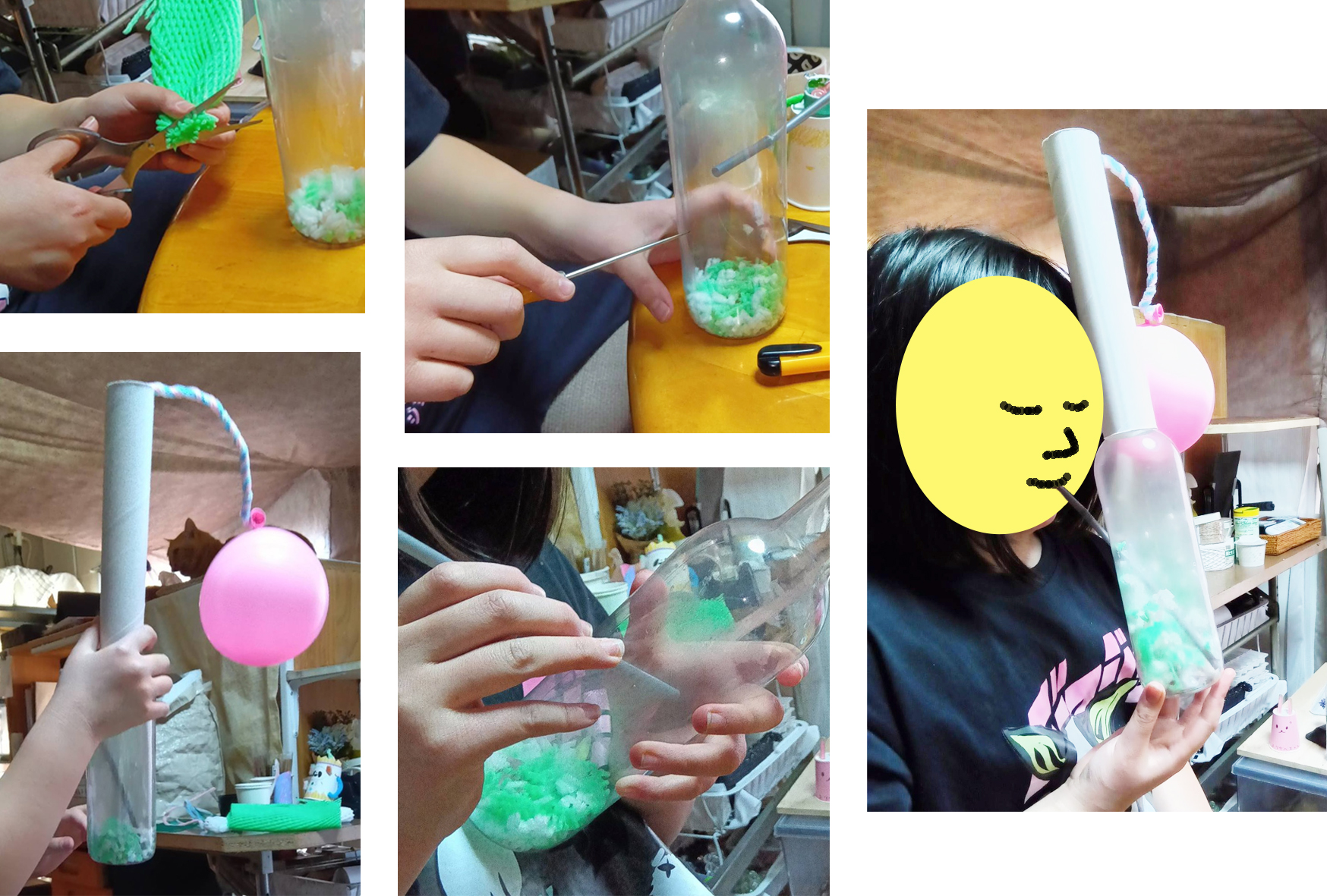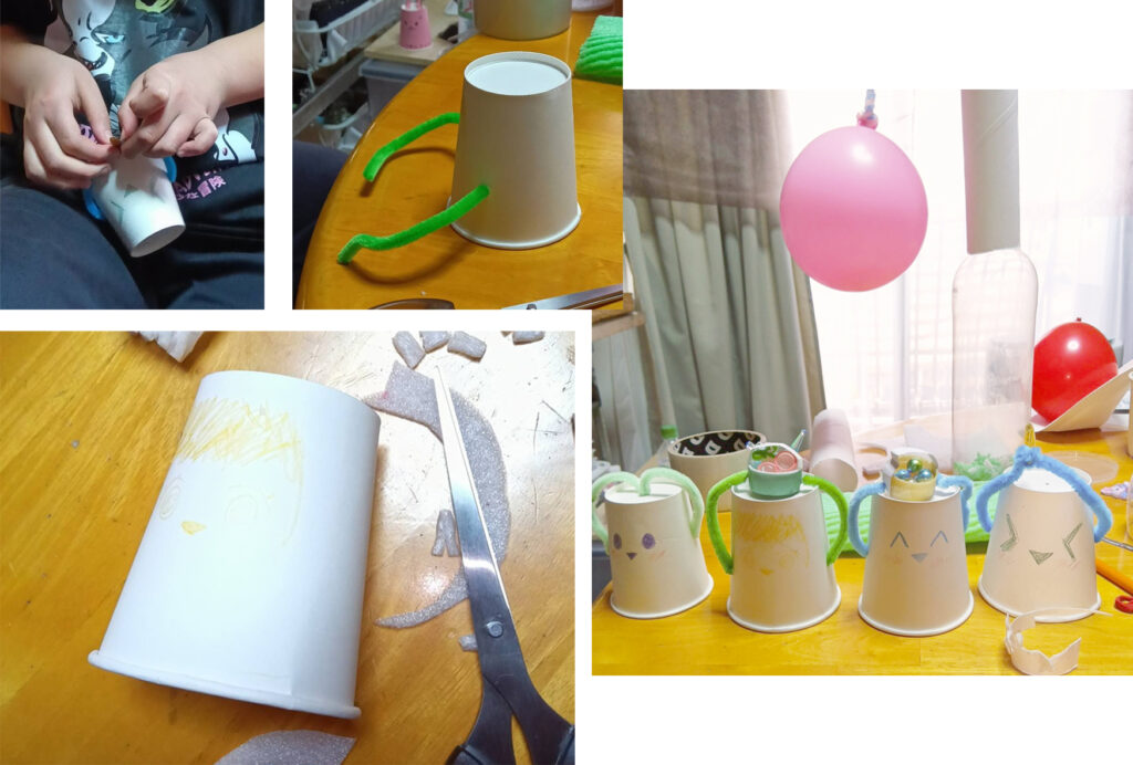 前回作った、カップの兄弟3人をテーブルに並べて、もう1人作ると言ってます。顔を描いて、モールの手を付けてます。最初、発泡スチロールの梱包材で帽子を作っていたのだけど、取りやめました。可愛さが、イマイチだったみたい。そのスポンジを細かく切ったやつ、軽くてフワフワしているので、びんの中で、遊べるんではないかな?とビンの口からストローで吹いて試させてもらったら、いい感じに飛びまわってます。Kちゃん、もうひとつ工夫して、ビンの横に穴を開けて、ストローを入れてみます。空気が逃げたほうが良さそうなので、キリで穴も開けていきます。思いつくと、手早いのです。手が先に動いていく感じです。サクサク、ガタッ、キュ!忙しく、いろんな音が聞こえてきます。