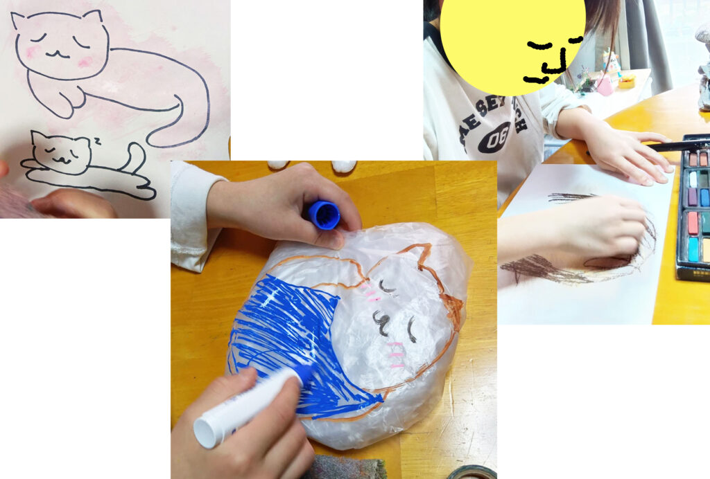 写真-2 中央は、猫クッション。右上はパステルにトライしているところ。左上は、サインペンと水彩でネコを描いて遊びます。