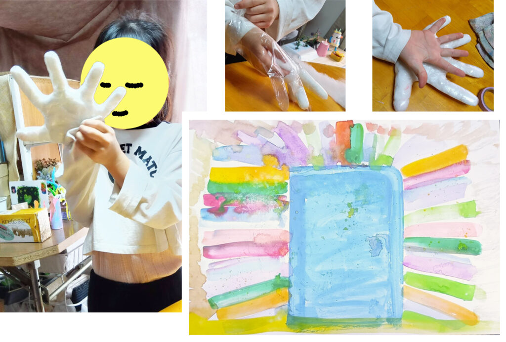 ポリエチレンの手袋に、綿を詰めて、スクイーズみたいになるかなーと思って、と渡してみたら、綿を細かくちぎって、どんどん詰めて、手のぬいぐるみみたいになりました。洋服の袖の中に入れて、大きな手で遊んでます。大人のMサイズだけど、だいぶ大きいんですねー!