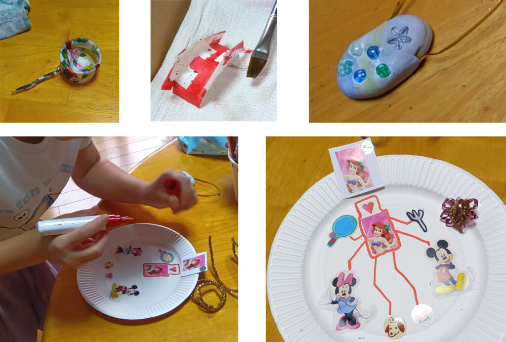 「さて、あと30分くらいだけど、何しようか?」。「そうだ、何作ろうかな?」いろいろ材料箱を見てるうち、シールがあったので、そこを探して使えそうなものを探します。ディズニーのアリエールのシールを見つけて、アイデアが浮かんだようでした。