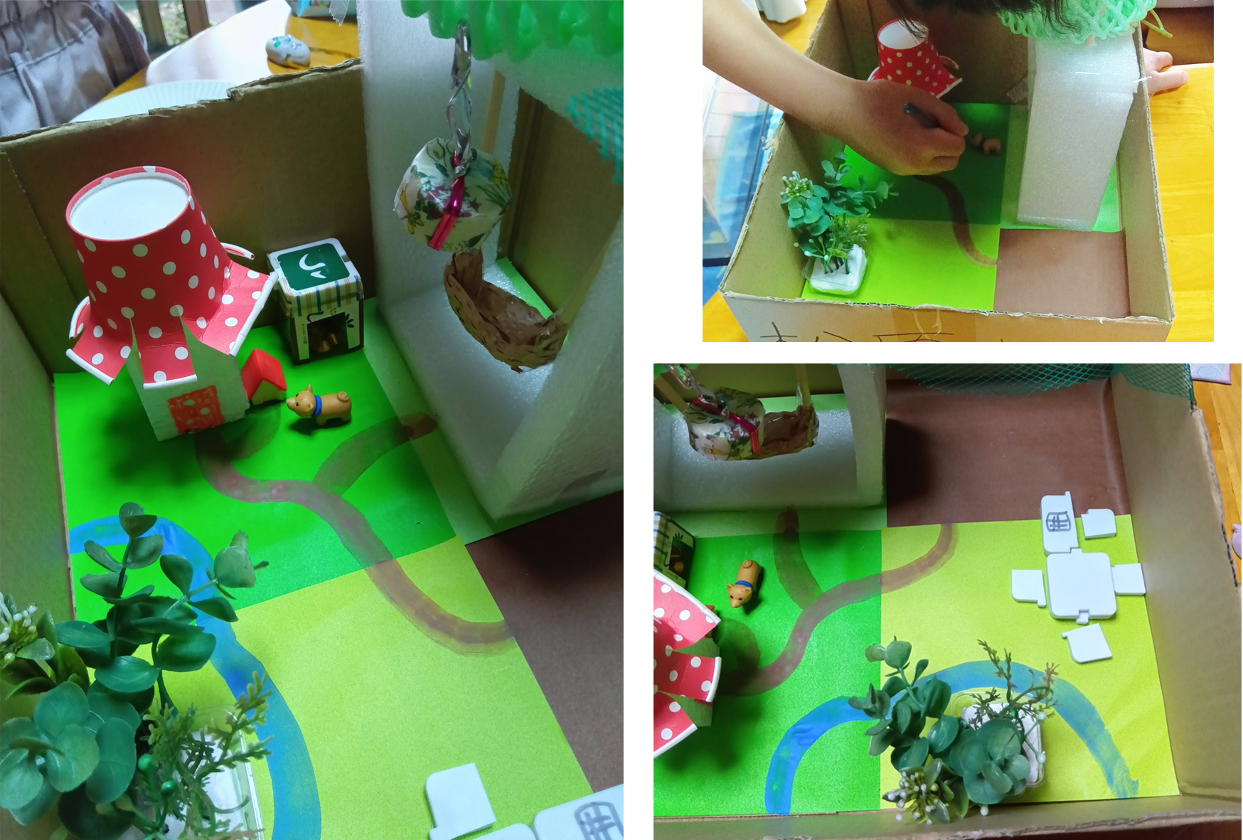 ダンボール工作の続きです。ダンボールの中に、中庭が広がっているのです。今日は、お家から材料を持って来ているのでした。