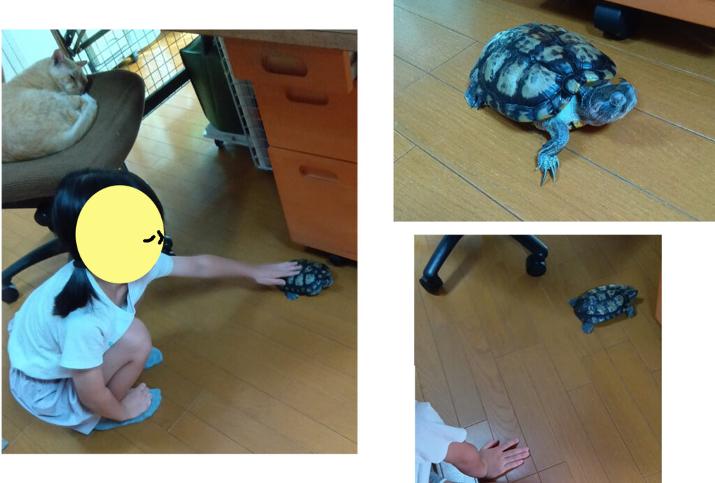 「カメを水槽から出して見てみたい」とAちゃんから、リクエストがありました。ちょっと散歩させて遊びました。