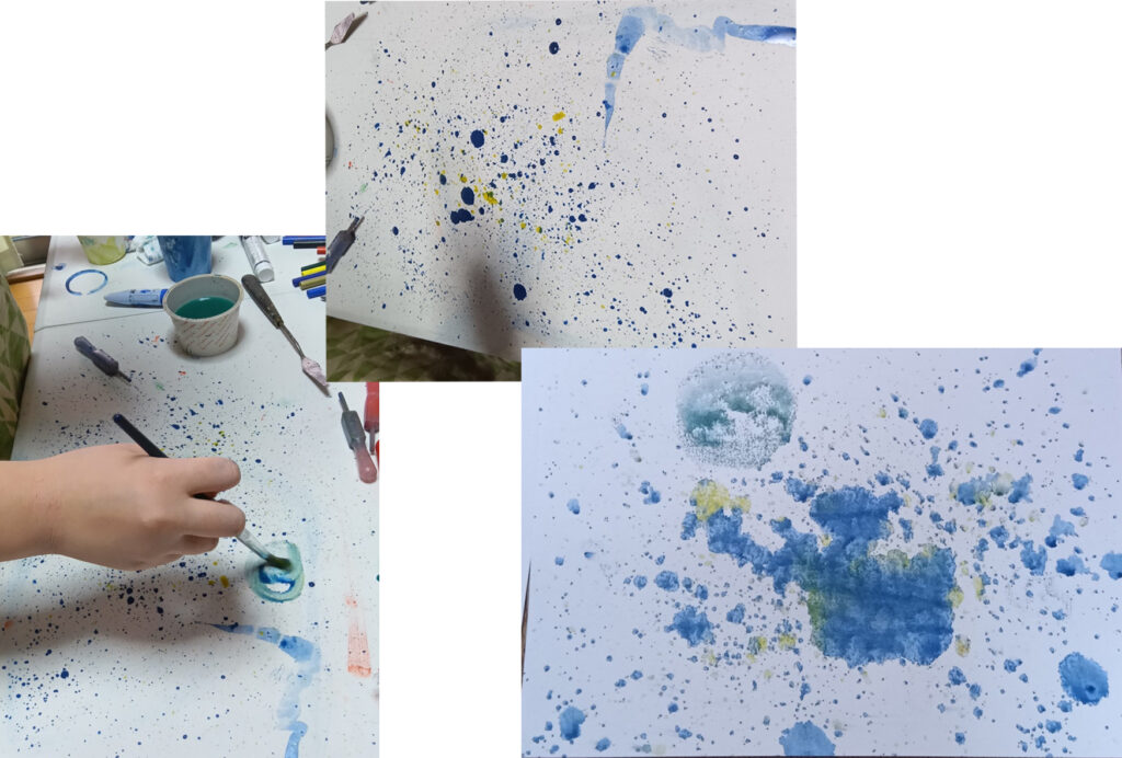 材料をいろいろテーブルに運んで、何か作り始めます。風船をふくらませてます。ヒモで紙コップとつないでみる。風船をのせてみる。風船にかぶせてみる。風船と紙コップに絵を描く。紙コップを持って、けん玉みたいに風船をキャッチしようと遊ぶ。Iちゃん、カラダを動かしているのだなあ。私は、じっとして水彩をスポイトで遊びながら、これは、Iちゃんのウォーミングアップみたいなことかな、と思いました。