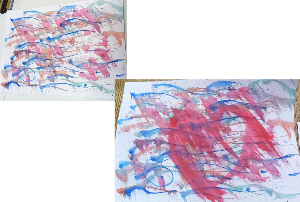 Iちゃんも、水彩を始めました。絵を描く、というより、絵の具を落として遊んでいく。イマイチだなあと思ったら、新しい画用紙でまた始めるのです。
