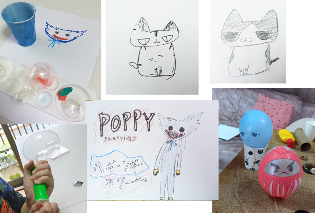 写真-1 ウォーミングアップのような最初の絵と工作。手を動かしながら、何が楽しいか、探していきます。
