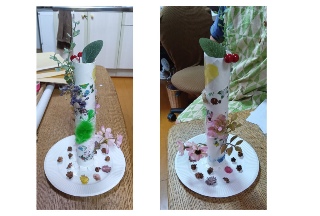 写真-5 キッチンペーパーの芯に、造花や、いろいろな素材を貼り付けて、華やかになりました。
