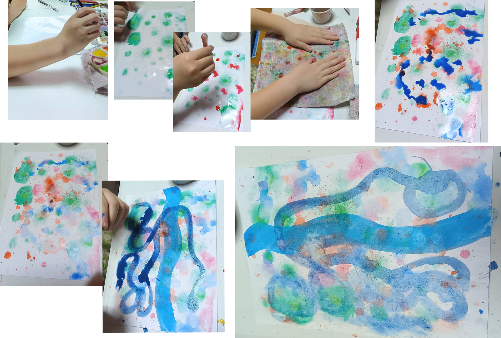 筆を持ったまま、けっこう長いこと考えてました。それから、ゆっくり、緑の色を垂らしてます。私の番も回って来ます。2回、回ってきて、その後「やっぱり、これは私の絵にする」、と言います。もちろんOKです。というより、約束したルールよりも、もっと大事なことが出てきて、それを表現した(言ってみた)のが、すごく大事なことだと思いました。そのあとは、とてもいい感じの集中で、どんどん描いていました。青い龍が登場したみたいな、素敵な絵だと思います。