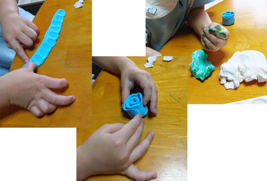 写真-1 紙粘土に絵の具を混ぜる、伸ばす、指で跡をつける、丸める。こうしたら、こうなる!という手順を楽しんでます。バラの作り方、教えてくれました。