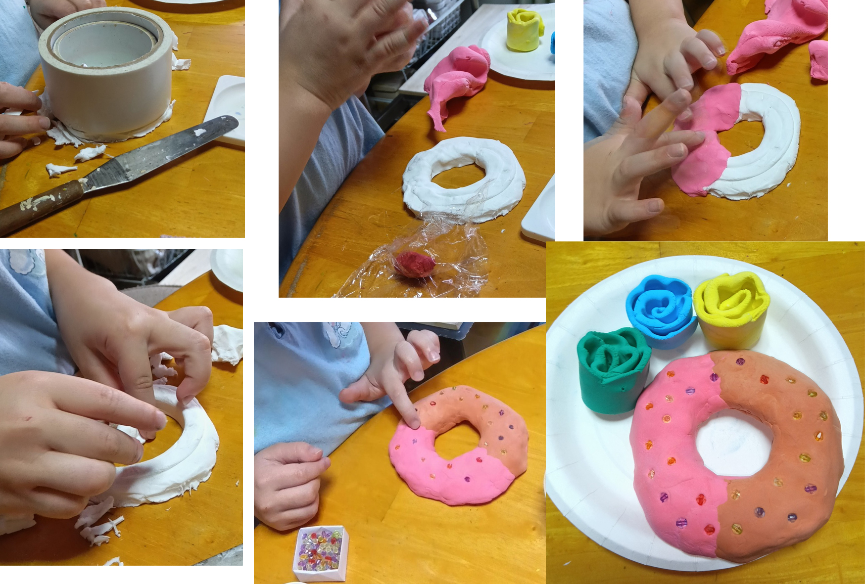 ドーナツの穴、もう少し小さくしたいんだけど。。じゃあ、紙粘土を内側に足すのは?どうやってやるの?やりとりがちゃんと続きます。紙粘土を転がしながら伸ばして、これを内側にくっつけるのは?提案は採用されて、ドーナツの穴は小さくなりました。